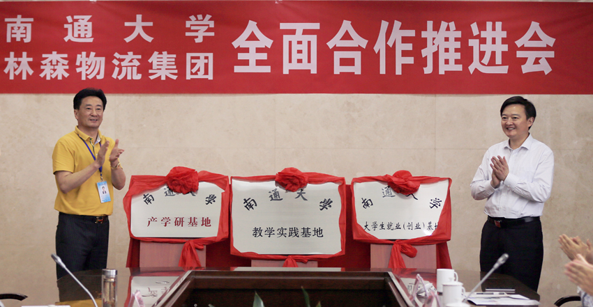 5月25日下午,我校与林森物流集团举行全面合作推进会,双方将共建产学研基地、教学实践基地、大学生就业(创业)基地。校长程纯,林森物流集团董事长、总裁沈林代表校企双方为基地揭牌。
