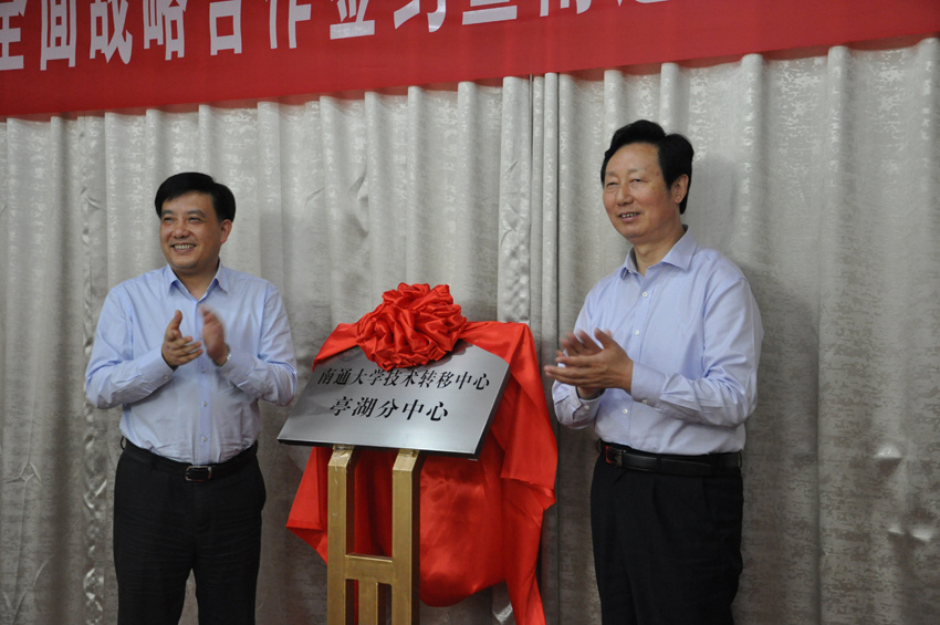 成长春书记与亭湖区委书记李东成共同为“南通大学技术转移亭湖分中心”揭牌。