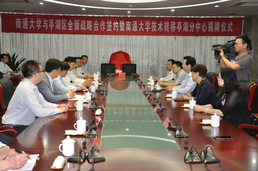 6月8日,校党委书记成长春率队赴盐城,举行南通大学与盐城市亭湖区全面合作签约暨南通大学技术转移亭湖分中心揭牌仪式。成长春书记与亭湖区委书记李东成共同为“南通大学技术转移亭湖分中心”揭牌,副校长丁斐代表学校与亭湖区签订合作协议书。