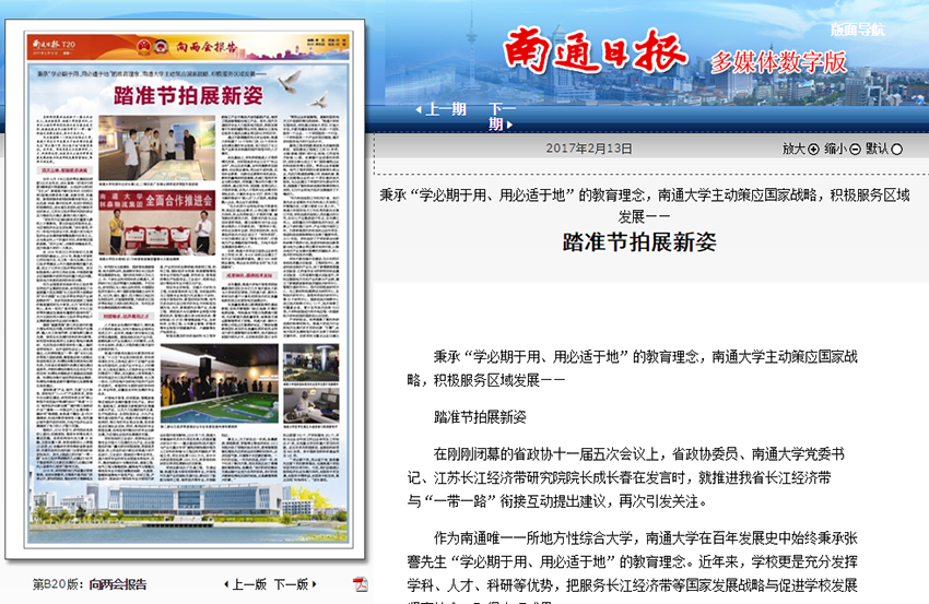 在南通市两会召开之际,2月13日出版的南通日报刊发题为《踏准节拍展新姿》的专版报道,详细介绍我校发挥学科、人才、科研等优势,把服务长江经济带等国家发展战略与促进学校发展紧密结合所取得的丰硕成果。