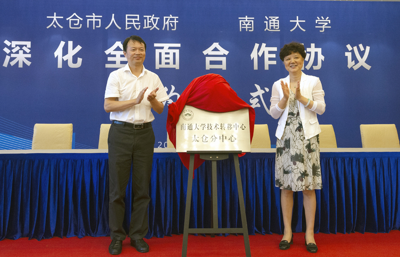 副校长丁斐与太仓市副市长许超震共同为“南通大学技术转移中心太仓分中心”揭牌。