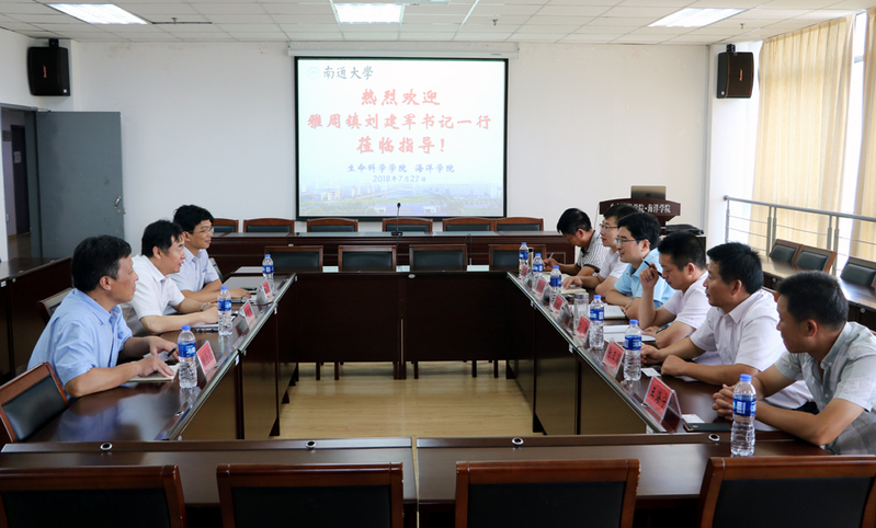 7月27日,海安市雅周镇党委书记刘建军一行来校洽谈产学研合作。校服务地方工作处常务副处长高江宁、生命科学学院党总支书记吉明明、院长姚登兵出席洽谈会。