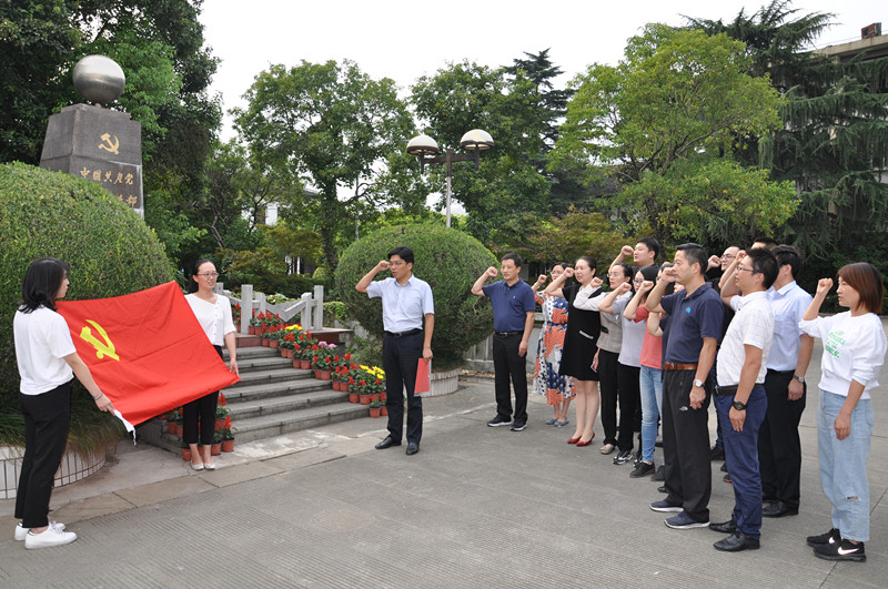 服务地方工作处党支部和科学技术处党支部的党员在纪念碑前聆听了大生集团有限公司副董事长、总会计师漆颖斌关于独立支部光荣历史的讲解,瞻仰了绿树掩映下的纪念碑,在服务地方工作处党支部书记高江宁的带领下重温了庄严的入党誓词。