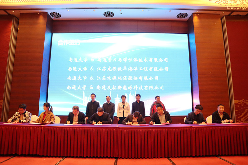 会上,我校现场推介了高端纺织、智能装备、电子信息、新材料、节能环保、船舶海工等6个领域的9项科技成果。经过交流对接,化学化工学院欧昌进,机械工程学院姚建南、谭林伟,信息科学技术学院程实分别与江苏京源环保有限公司、南通普力马弹性体技术有限公司、江苏龙源振华海洋工程有限公司、南通友拓新能源科技有限公司签订了产学研项目合作协议。