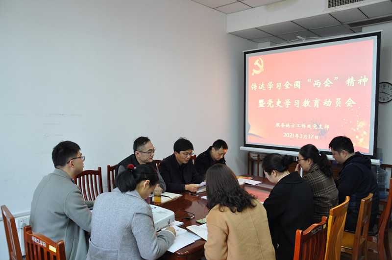 3月17日,服务地方工作处党支部召开专题学习会议,传达贯彻全国“两会”精神和学校党史学习教育动员会精神,对支部开展党史学习教育工作进行动员和部署。支部书记高江宁主持会议。